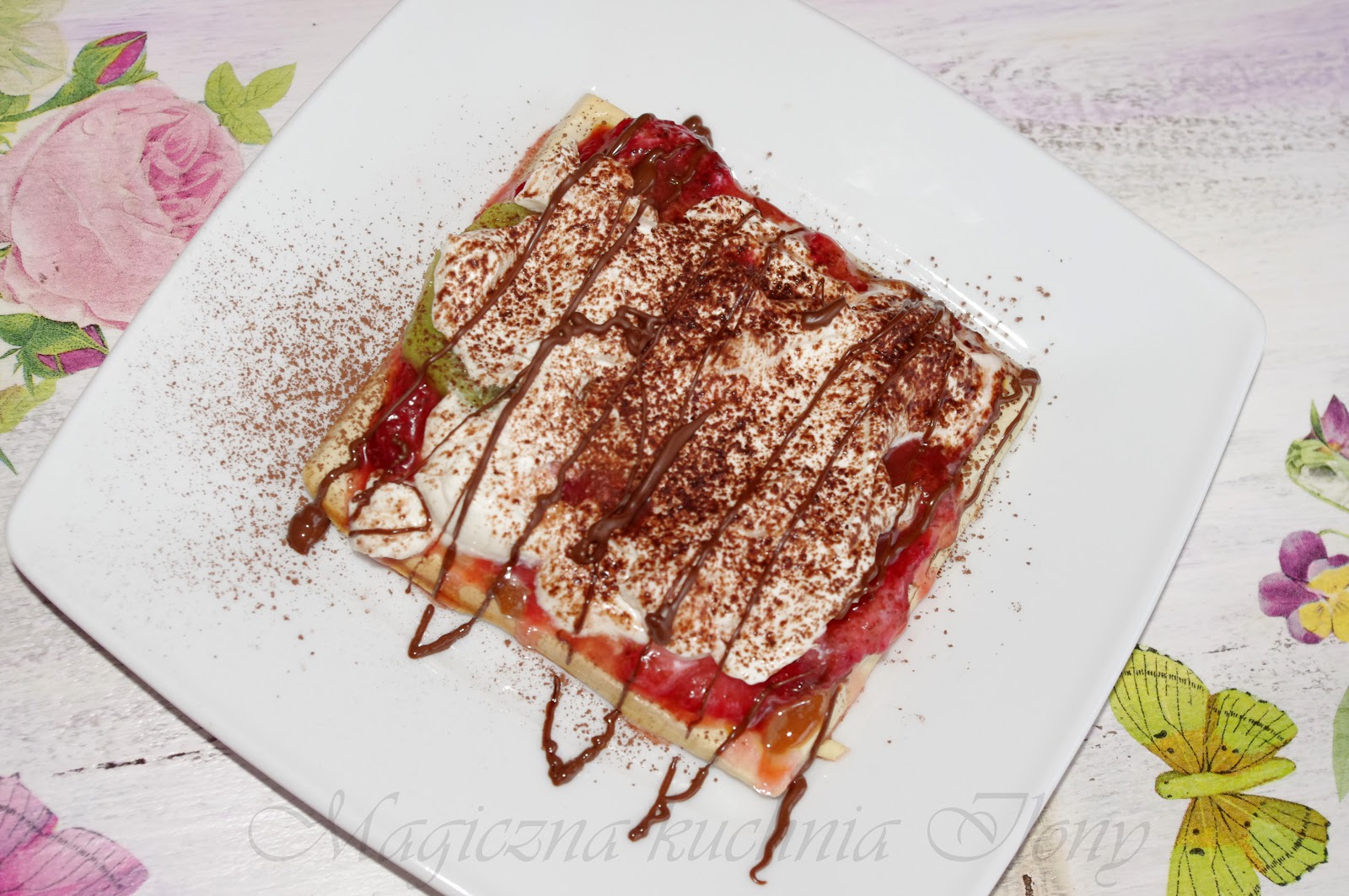 Robimy gofry według przepisu który podawałam TUTAJ. Następnie w kąpieli wodnej podgrzewamy masę krówkową, aby miała konsystencję sosu i polewamy naszego gofra. Kolejną warstwą są owoce. Truskawki delikatnie rozgniotłam widelcem, położyłam, zaś kiwi pokroiłam w plastry, które przykryły kolejną warstwę. Teraz czas na śmietanową masę. Można użyć bitej śmietany, kremówki lub gotowej (choć tej nie polecam). Ja ubiłam serek mascarpone z zagęszczonym mlekiem w stosunku 3 łyżki serka na 1 pełną łyżkę mleka. To nasza delikatna i biała warstwa. Teraz dekoracja, całość posypujemy dobrej jakości kakao i robimy zygzaki z gorzkiej czekolady, rozpuszczonej w kąpieli wodnej