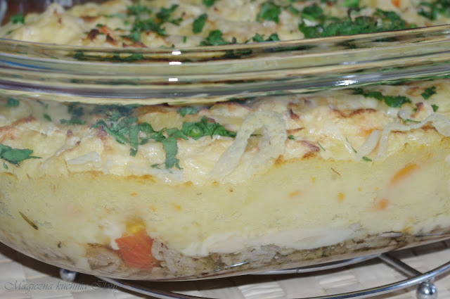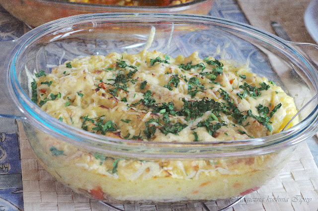 Dzisiaj na obiad proponuję pyszną ziemniaczaną zapiekankę. Osobiście uwielbiam ziemniaki pod każdą postacią, więc jak tylko usłyszałam w jakimś programie kulinarnym "brytyjska zapiekana z ziemniaków" wyskoczyłam z kuchni jak oparzona, biorąc kartkę i długopis w celu zapisania przepisu, niestety trafiłam na sam koniec i jedyne co mogłam to zrobić, to zapamiętać jej wygląd, kilka składników i wykonać ją po swojemu. Z resztą, to nie pierwsza potrawa zrobiona po mojemu.. mój mąż zawsze się śmieje, dodając "po iljońsku" przed nazwą dania :) Co oznacza, że jak zwykle zrobiłam coś inaczej.